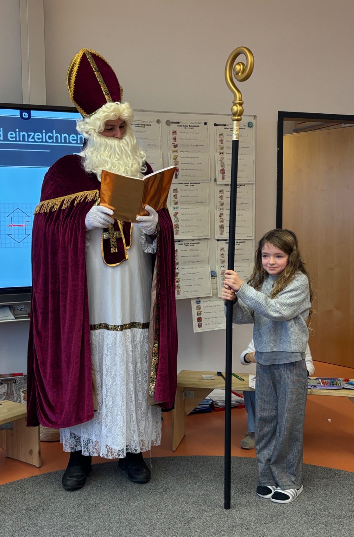 Am Freitag, den 5.12., hielt der Nikolaus Einzug in der Schule. Er besuchte jede Klasse, sparte nicht an Lob und zeigte den Kindern seine Zufriedenheit mit vielen Dingen. Natürlich hinterließ er auch in jeder Klasse einen großen Sack mit Geschenken. Ein gemeinsames Geschenk für die gesamte Schule gab es auch dieses Jahr: Im Januar darf sich die gesamte Schulfamilie auf einen Kinobesuch des neuen Checker-Tobifilms freuen.